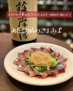 まろやかで豊かな甘みをもつ芋焼酎とあわせるあたご鯖【渋谷居酒屋/渋谷もつ鍋/渋谷焼酎/渋谷餃子/渋谷宴会/渋谷接待/女子会/渋谷しゃぶしゃぶ/駅近/恵比寿宴会/渋谷焼売/恵比寿女子会/代官山もつ鍋/クラフト焼酎/クラフトジン/渋谷九州料理/恵比寿焼売/渋谷穴場/恵比寿もつ鍋】