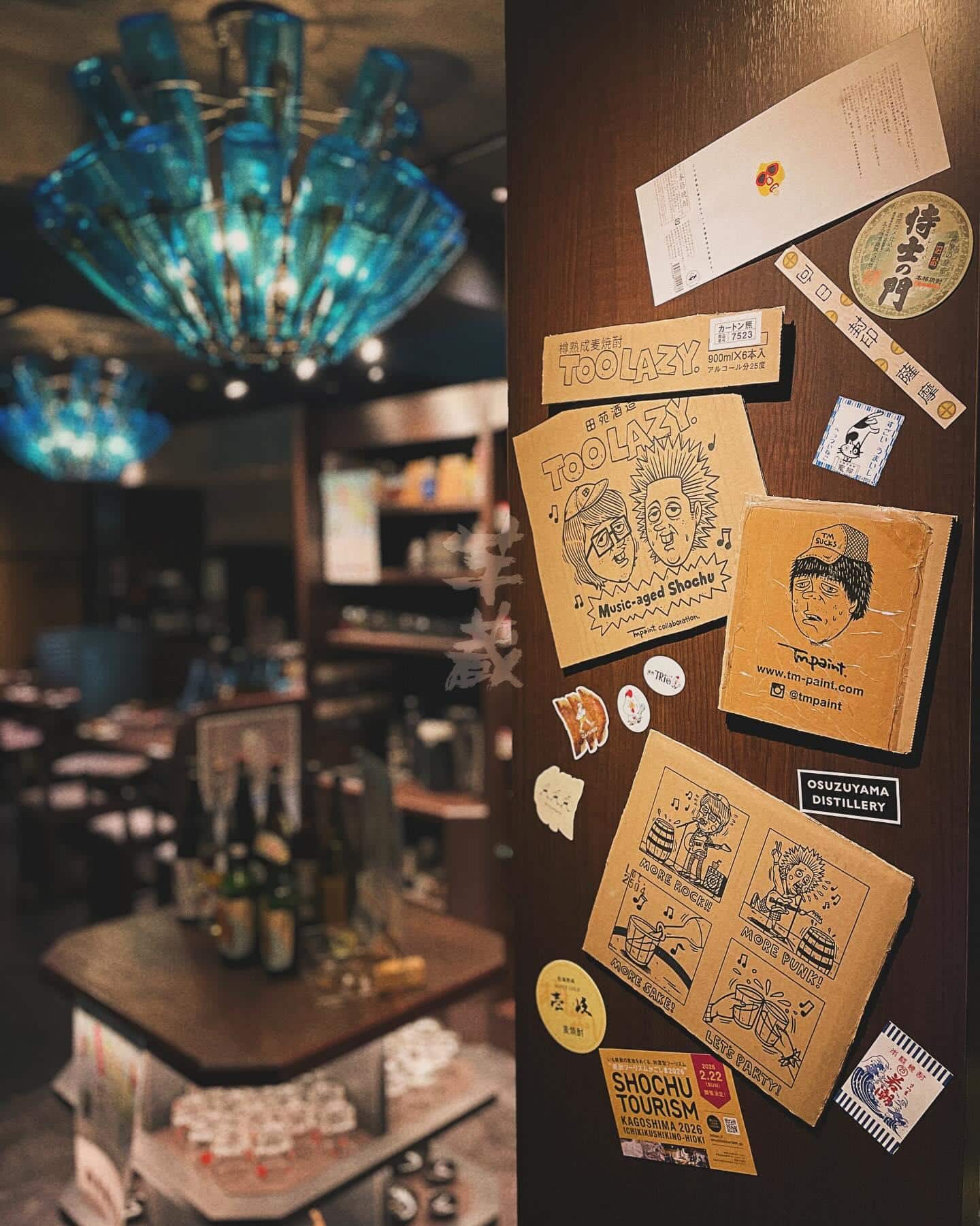焼酎セラー壁面に貼られた酒造さんのステッカー