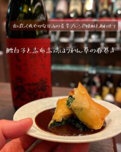 香ばしく爽やかな甘みの麦芋ブレンド焼酎とあわせる白子春巻き【渋谷居酒屋/渋谷もつ鍋/渋谷焼酎/渋谷餃子/渋谷忘年会/渋谷接待/女子会/渋谷しゃぶしゃぶ/駅近/恵比寿忘年会/渋谷焼売/恵比寿女子会/代官山もつ鍋/クラフト焼酎/クラフトジン/渋谷九州料理/恵比寿焼売/渋谷穴場/恵比寿もつ鍋】