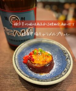 ホクホクの焼き芋をブリュレに。塩キャラメルソース、ベリーを添えて焼酎にぴったりなデザートです。
