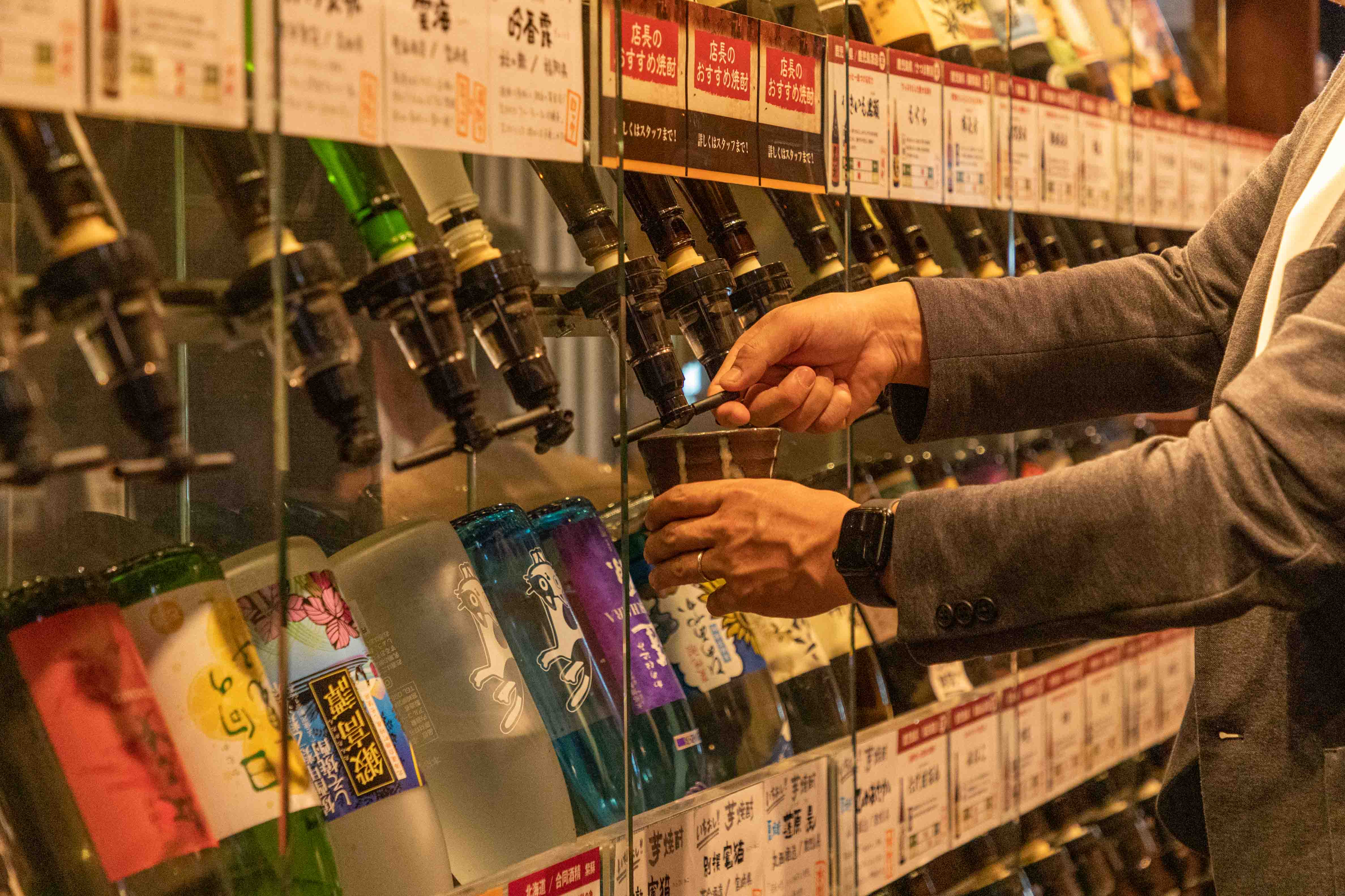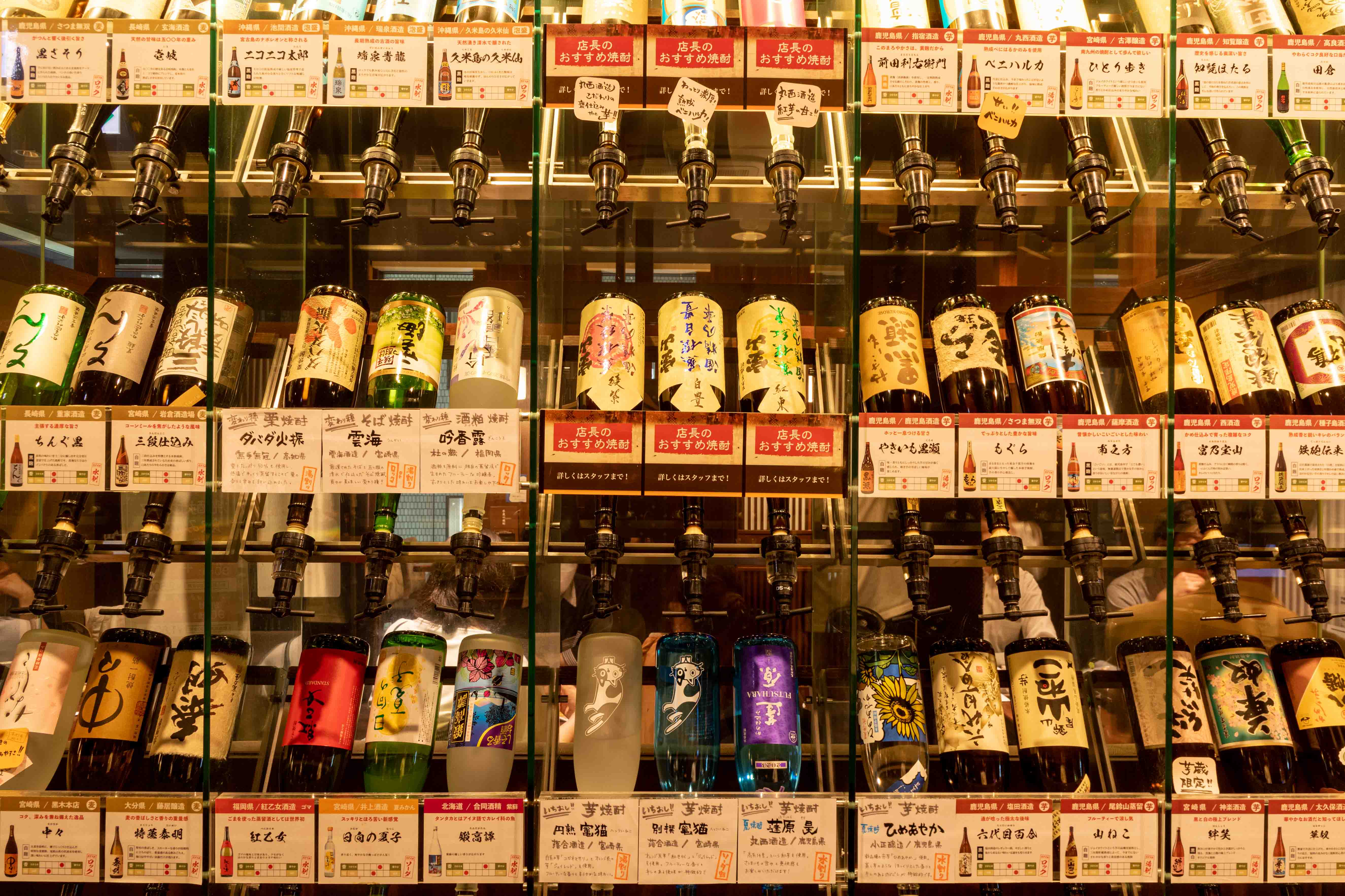 芋蔵といえば圧巻の「焼酎セラー」が特徴!ずらりと並ぶボトルは焼酎好きにはたまらない光景です。定番銘柄からプレミアム、変わり種まで種類豊富に揃えております。