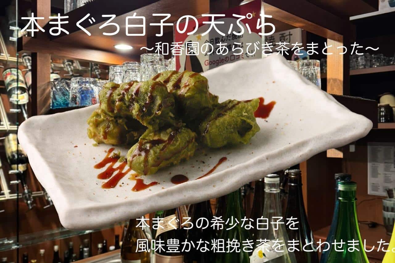 ちょっと珍しい本まぐろの白子を鹿児島県の老舗のお茶屋さん″和香園″さんの風味豊かなあらびき茶衣をまとわせた天ぷらにしました。