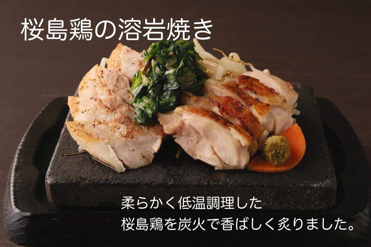 柔らかく低温調理された桜島鶏は、肉厚ジューシー。炭火で香ばしく炙ってから、桜島の溶岩プレートに!湯気が出るさまは、桜島の噴火をイメージします。
