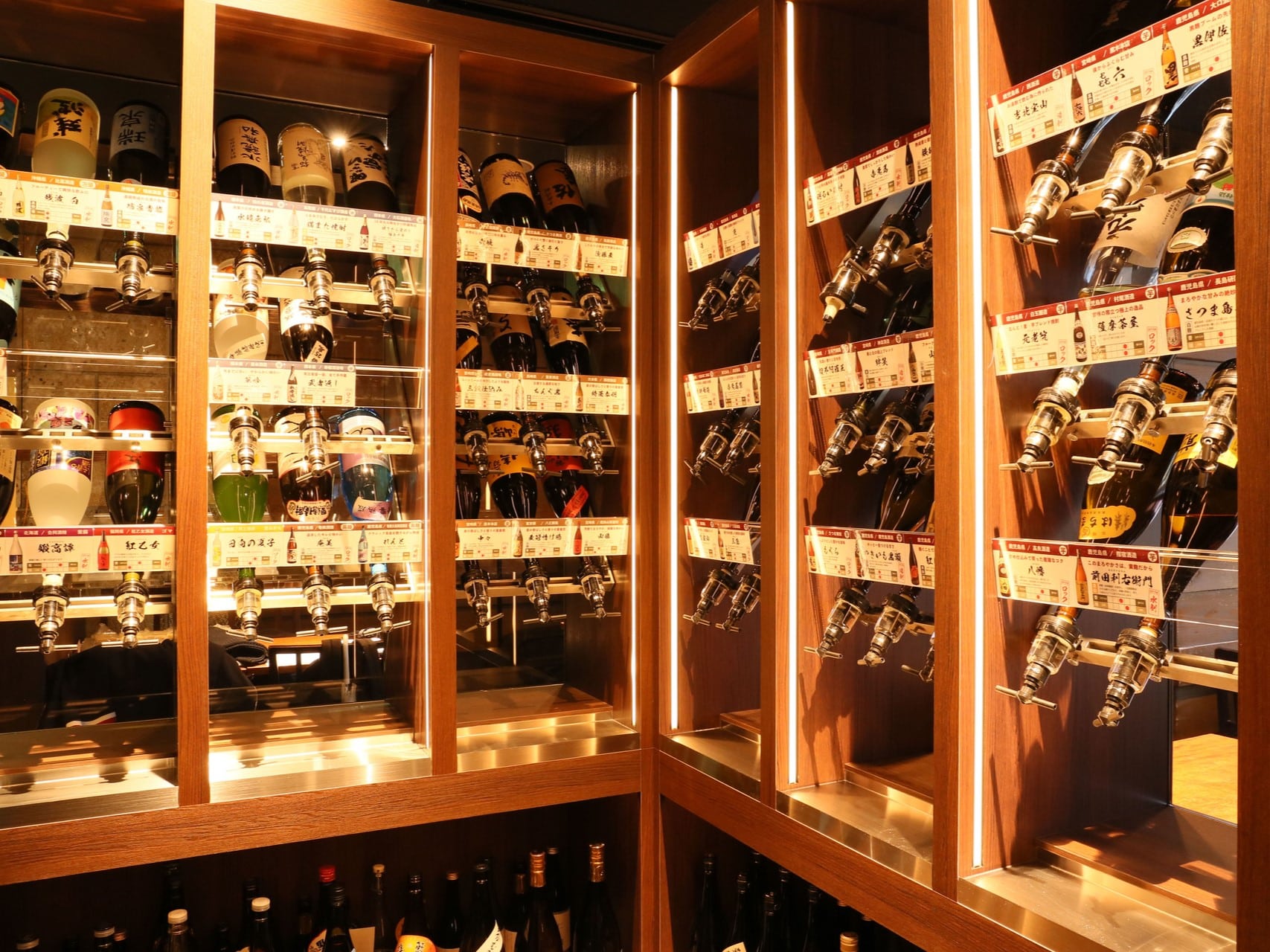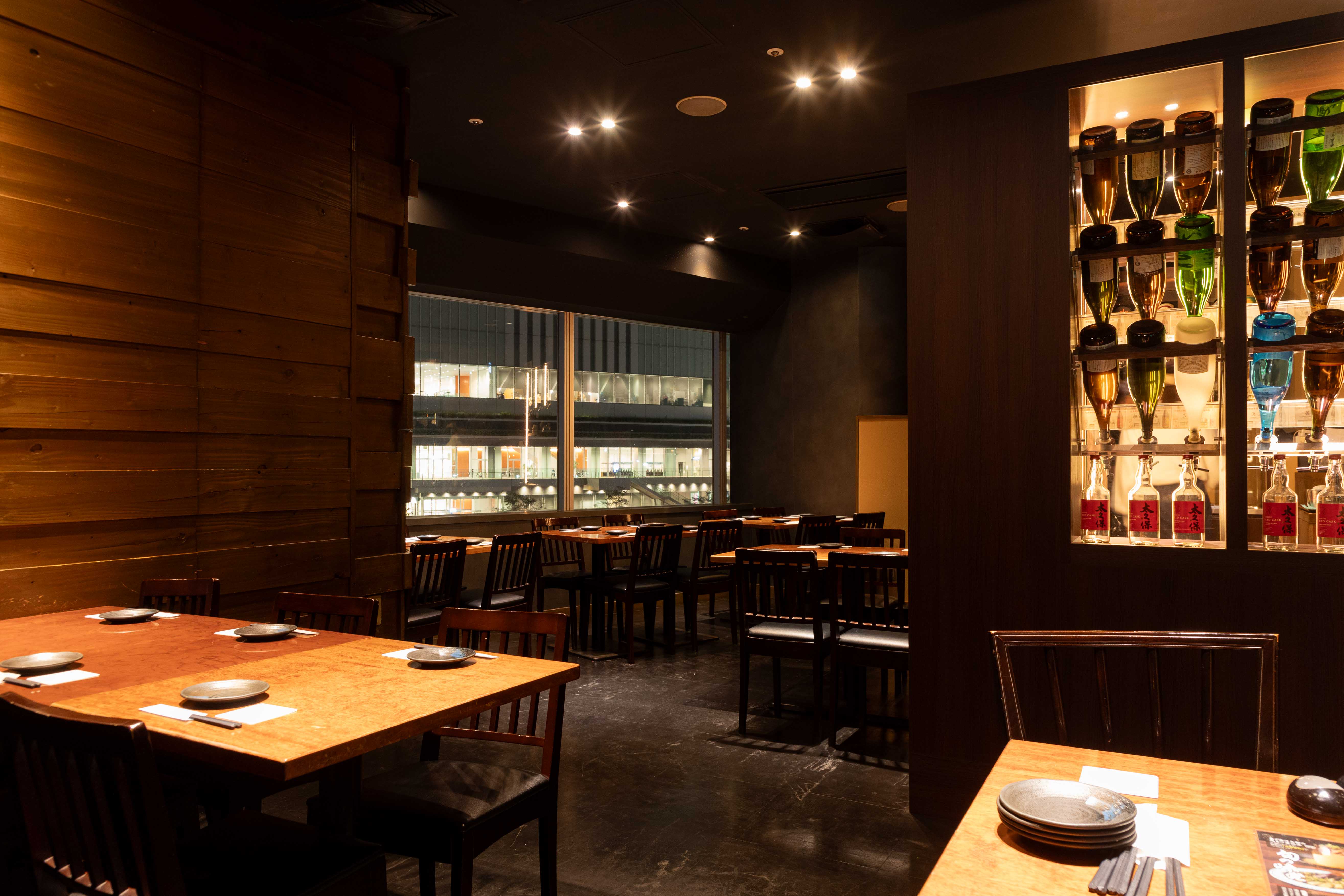 芋蔵といえば圧巻の「焼酎セラー」が特徴!ずらりと並ぶボトルは焼酎好きにはたまらない光景です。定番銘柄からプレミアム、変わり種まで種類豊富に揃えております。