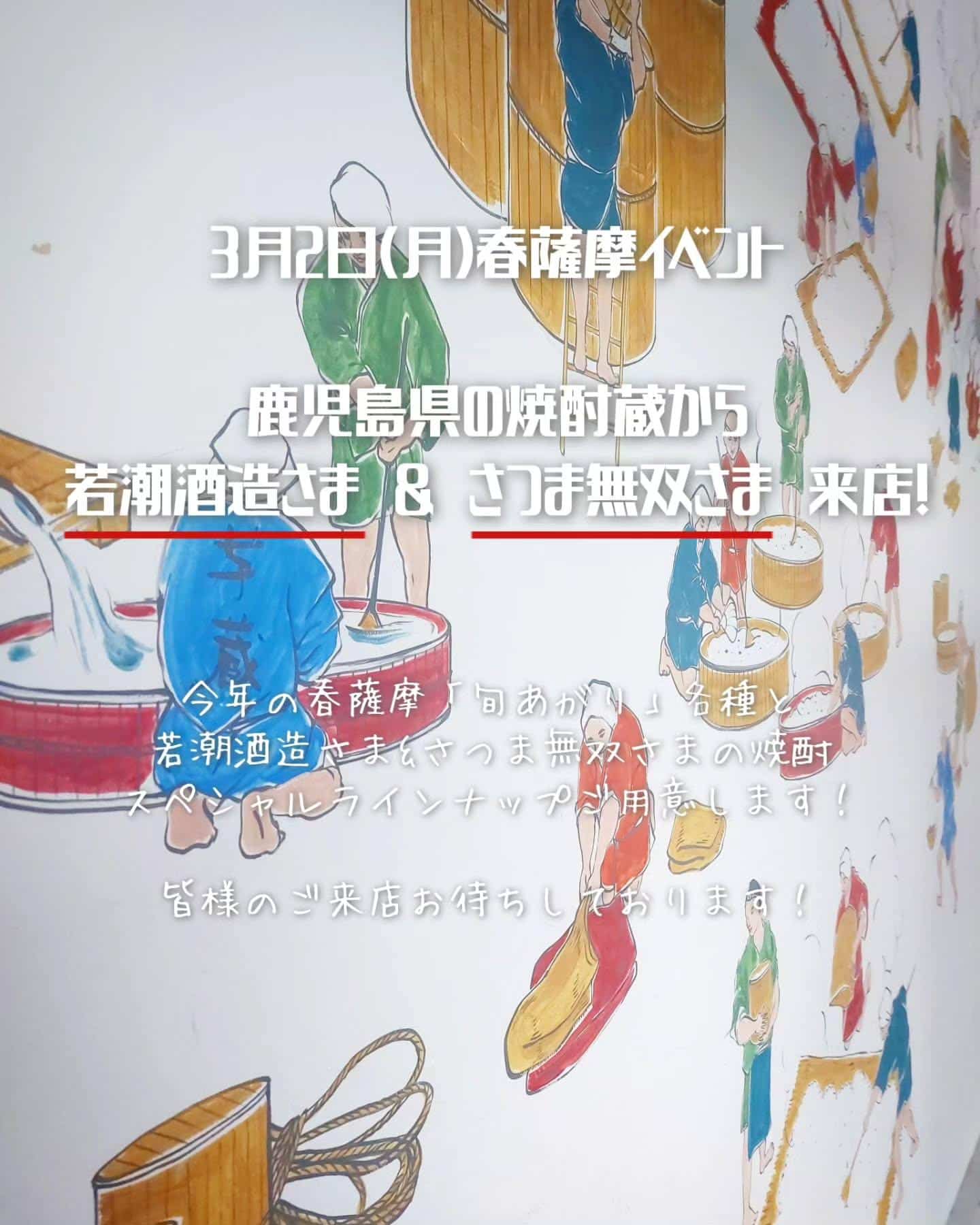 3月2日(月)若潮酒造さま、さつま無双さま来店イベント!《居酒屋/九州料理/忘年会/新年会/歓迎会/送別会/個室/もつ鍋/餃子/馬刺/芋蔵/新宿/焼酎/飲み放題》