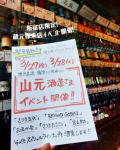 鹿児島県山元酒造さまイベント開催!3/27(金)、3/28(土)《居酒屋/九州料理/忘年会/新年会/歓迎会/送別会/個室/もつ鍋/餃子/馬刺/芋蔵/新宿/焼酎/飲み放題》