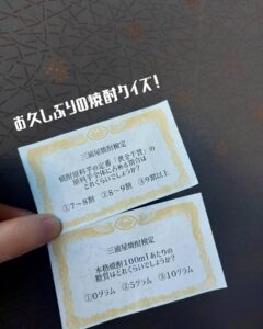 「三浦屋焼酎検定」と「芋蔵焼酎検定」と二種類ありまして、芋蔵検定は我らが購買部のお姉様が作ってくださっているもの。