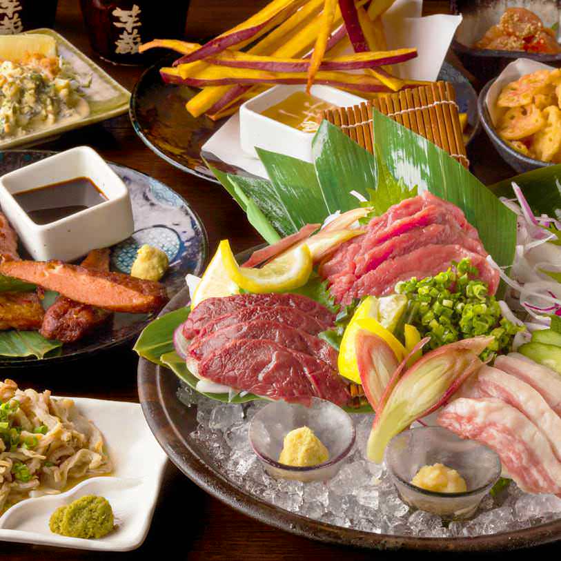 芋蔵渾身の春の肉尽くしコース!熊本名物の馬刺し盛り合わせ、黒毛和牛と黒豚を炭火でじっくりと焼き上げ、熱々の桜島溶岩プレートでご提供します。