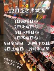 『12月第1週の空き席状況です。』《芋蔵/静岡/居酒屋/九州料理/焼酎/個室/利き焼酎/飲み放題/忘年会/送別会/20名以上宴会/もつ鍋》