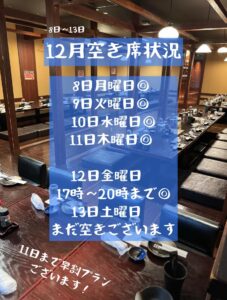 12月第2週月曜日から木曜日まで、まだ空き席ごさいます。